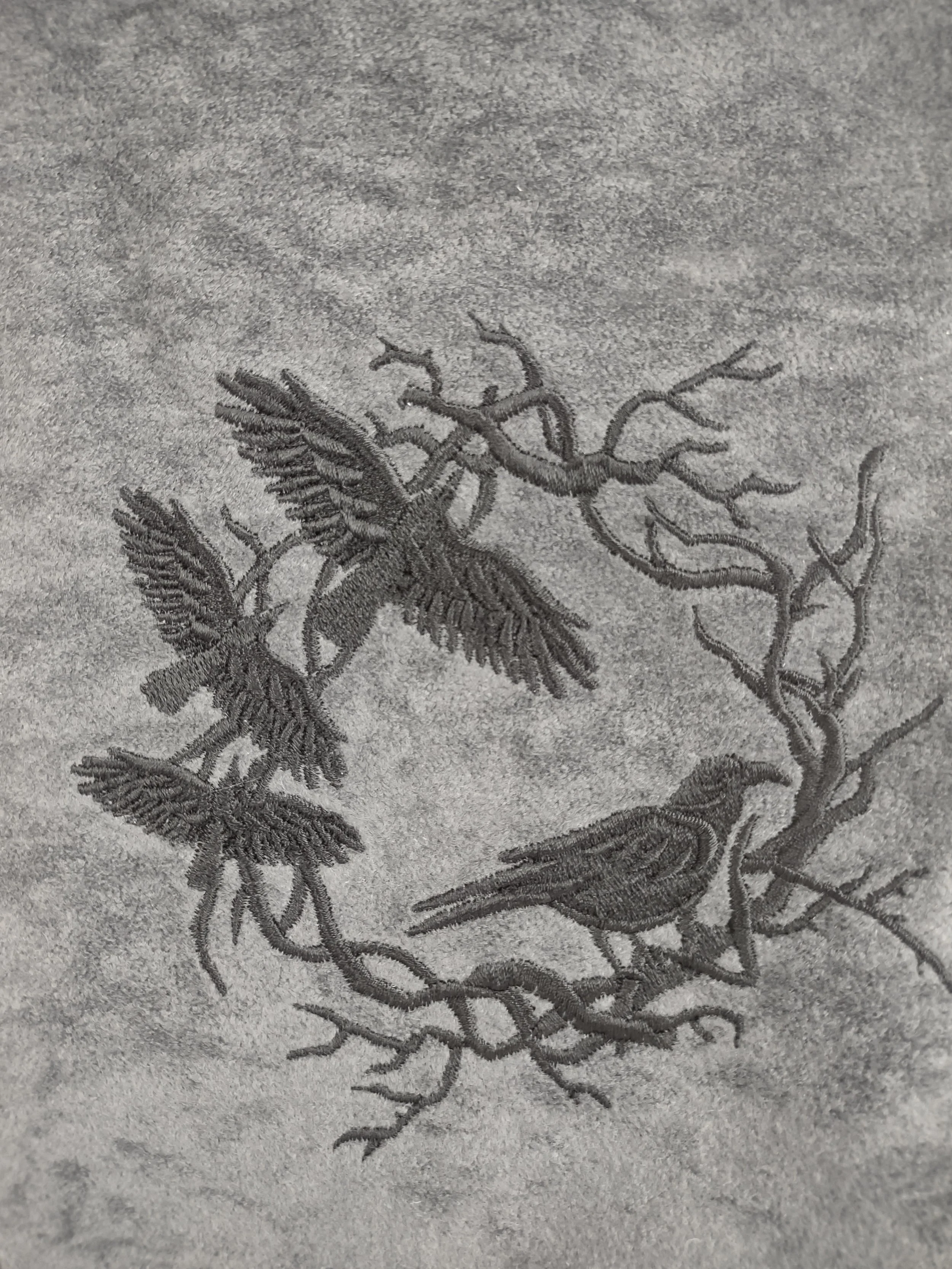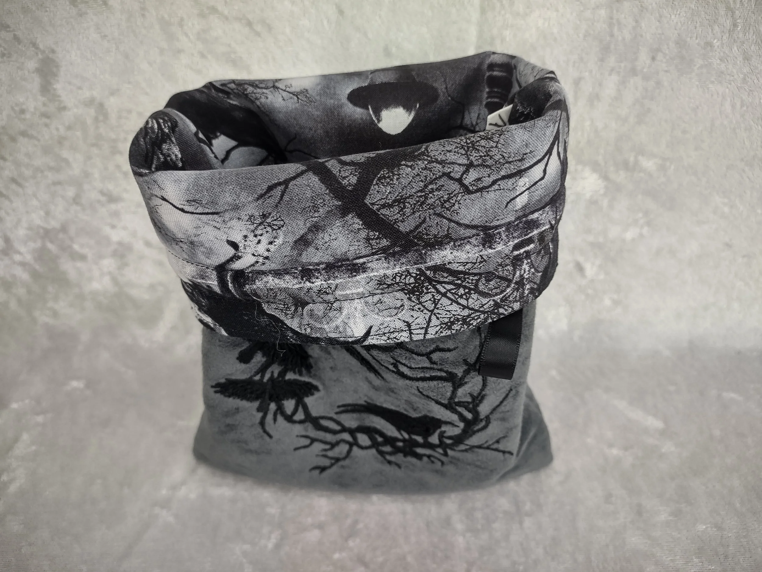 A gorgeous embroidery of a sign advertising a Black Cat Sanctuary decorates this magickal bag that’s perfect for card decks, dice, stones & crystals, runes, herbs or even use as a gift bag for that special item. Made from black suede cloth with the perfect matching black cat print cotton lining for the inside. 2 loops of silver ribbon make this drawstring closure a real cinch. Open flat, bag measures 7” wide x 9.5” high. When cinched, inside is 6” x 8”.