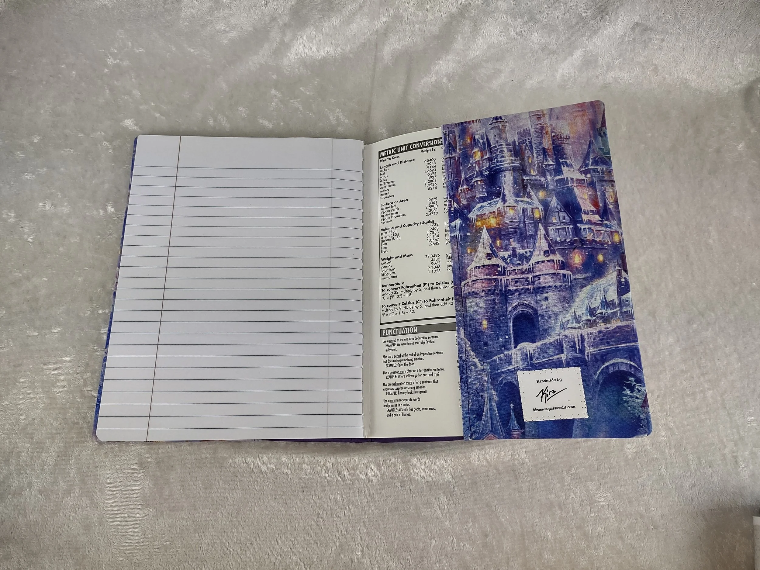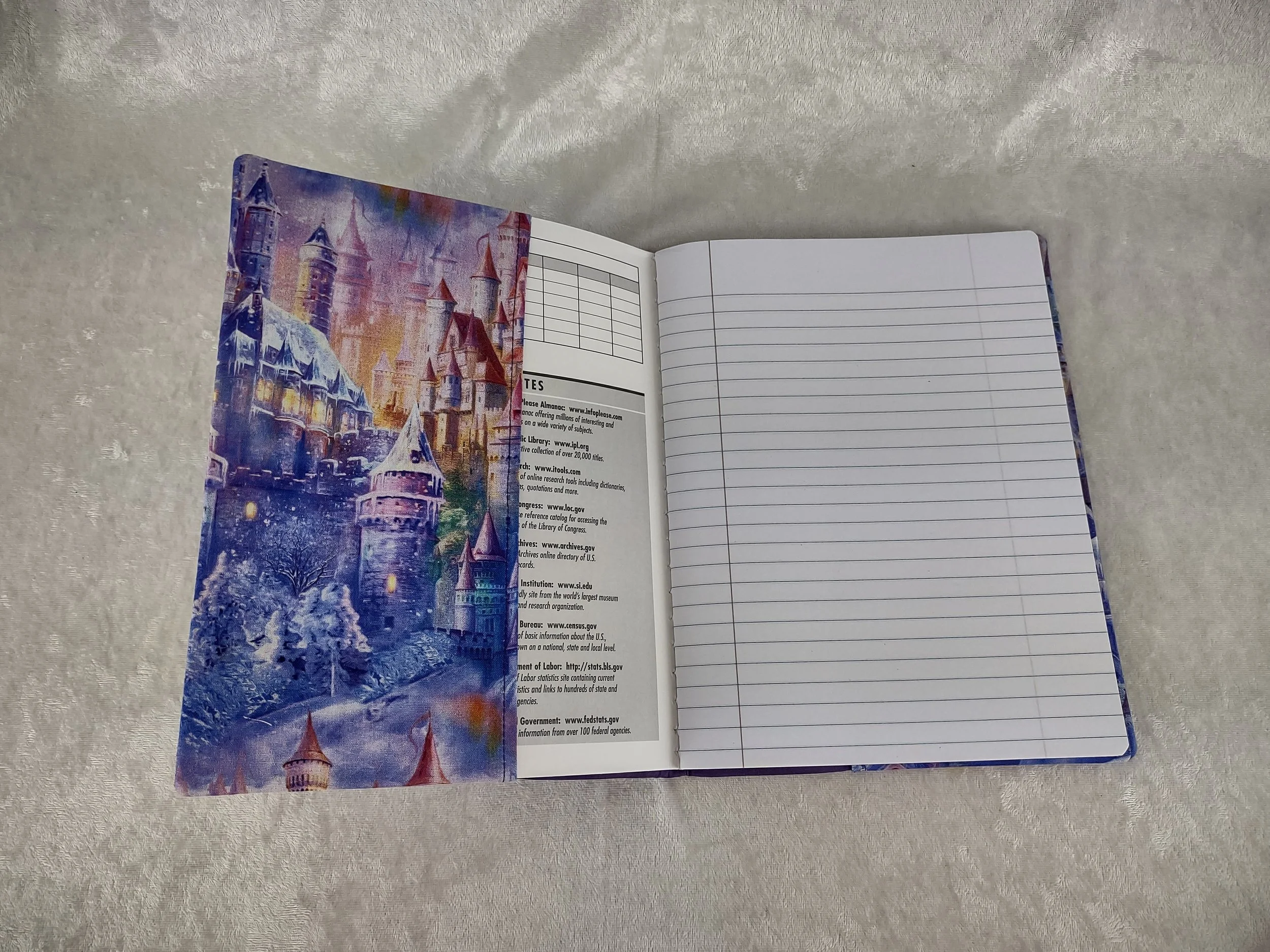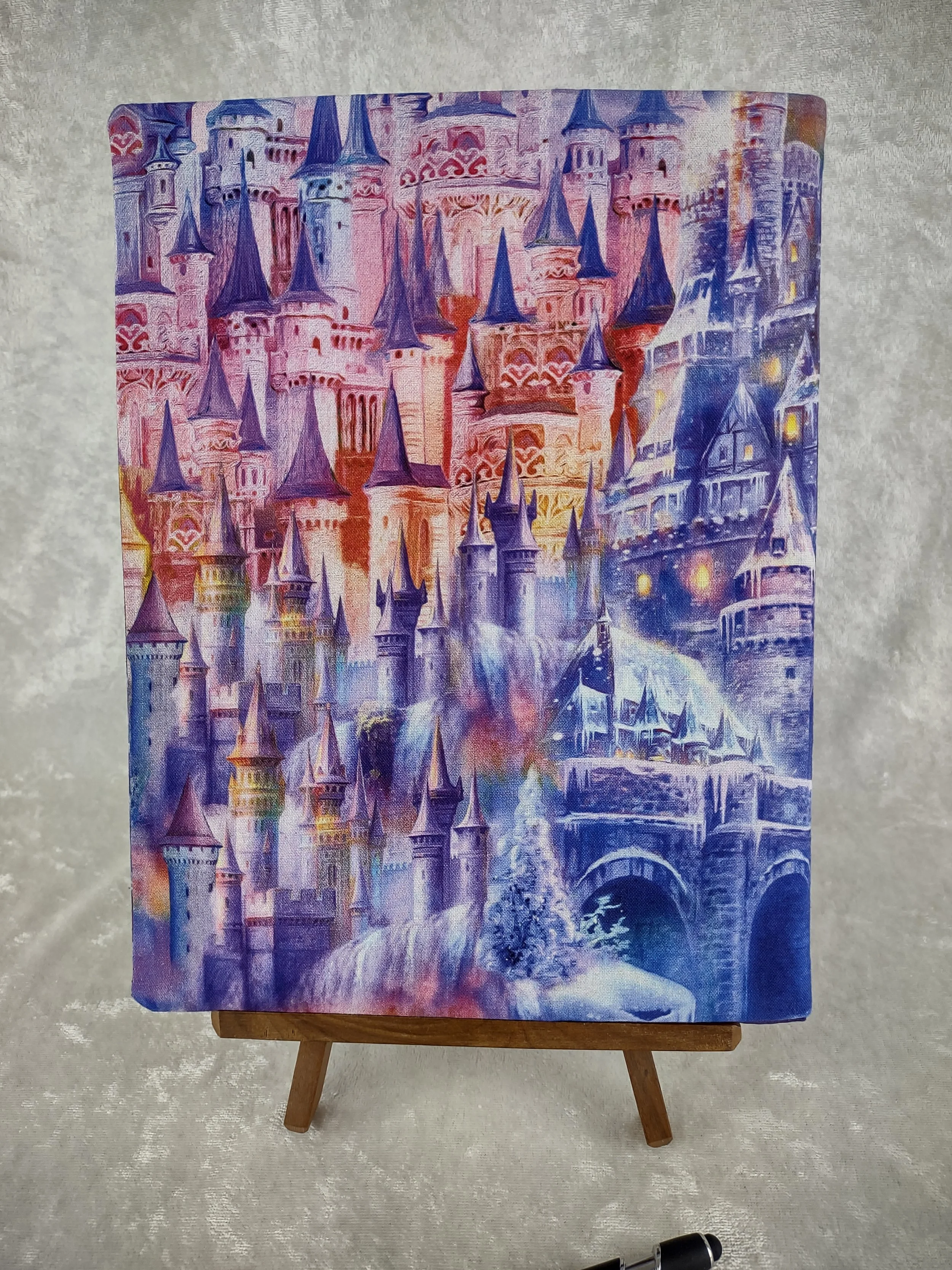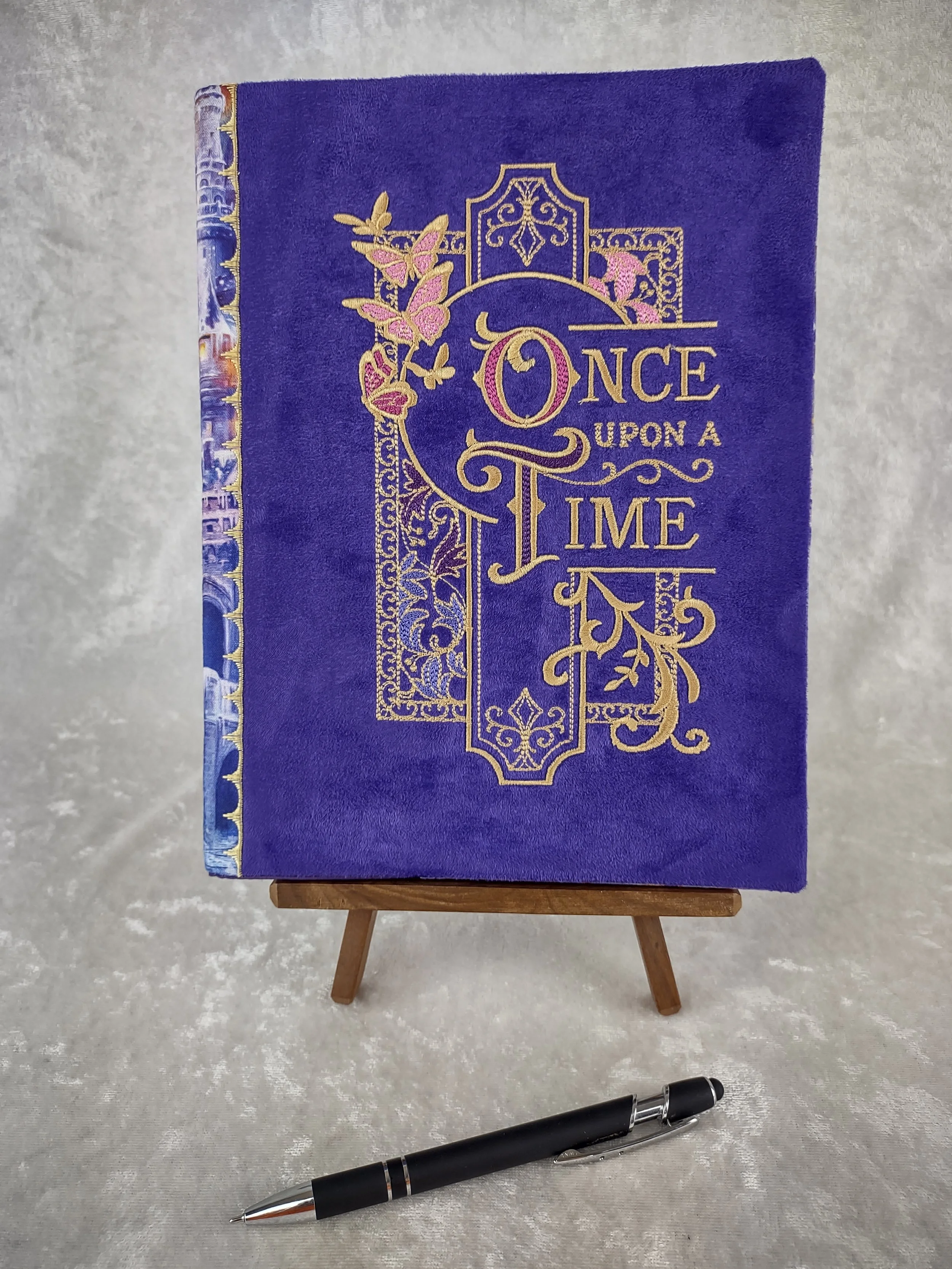 Refillable embroidered fabric notebook cover uses a standard composition book(included). An elegant embroidery stating “Once Upon A Time” is the star of this cover made from purple upholstery suede. Features a gorgeous fairy castle print cotton fabric to compliment the embroidery. Solid purple cotton for the lining. Outside fabric is backed with a craft weight fusible interfacing for durability.